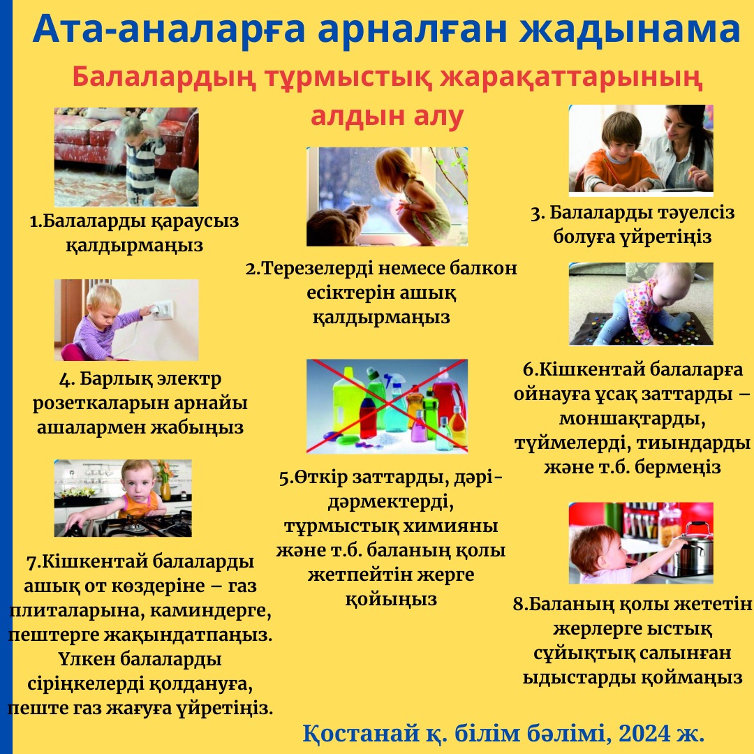 Әр ата-ананың міндеті- баланың денсаулығын сақтау, балаларды жарақаттанудың алдын-алу негіздеріне үйрету. Егер өзіңізді дұрыс ұстасаңыз, қауіпті алдын алуға болады. Тұрмыстық жарақаттар ең көп таралған. Сынықтар, ми жарақаттары биіктіктен құлау салдарынан пайда болады (терезе, диван, бесік-арба, ойын кезінде жоғары лақтыру), ыстық пештен, ыдыс-аяқтан, үтіктен, тағы басқа электр құрылғыларынан (ыстық шай, сорпадан) күйіп қалу, ашық от, белгісіз заттармен улану).