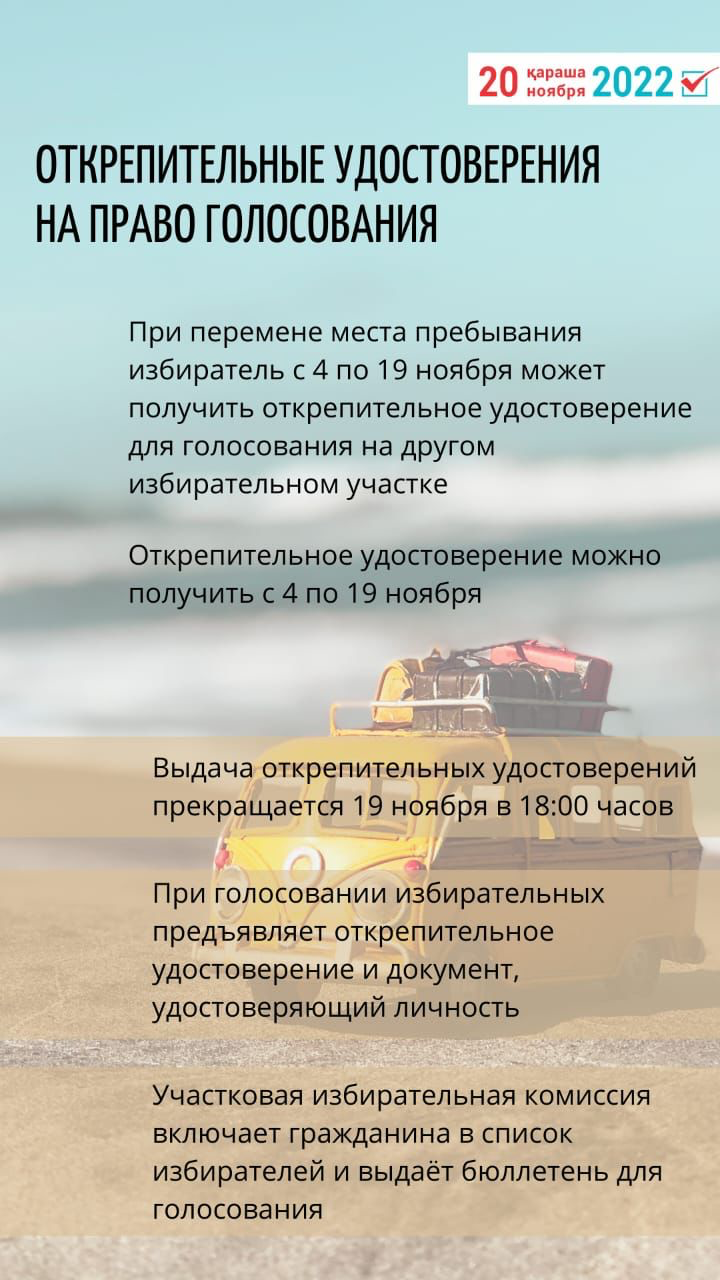 Егер Қазақстан Республикасының Президентін сайлау күні жол жүріп кетуіне байланысты азаматтың өз сайлау учаскесінде дауыс беру мүмкіндігі болмаса, онда оған баратын жеріндегі сайлау учаскесінде дауыс беруге болады. Ол үшін 4-19 қараша аралығында тіркелген жеріндегі сайлау учаскесінен алған есептен шығару куәлігі болуы қажет.