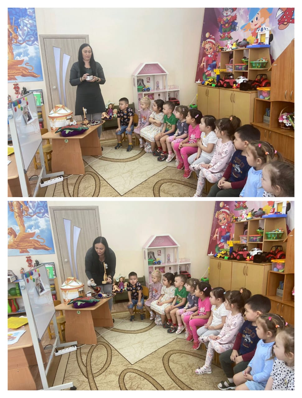 С целью формирования патриотического воспитания и эмоционального отклика на изучение казахского языка, дети познакомились с убранством юрты