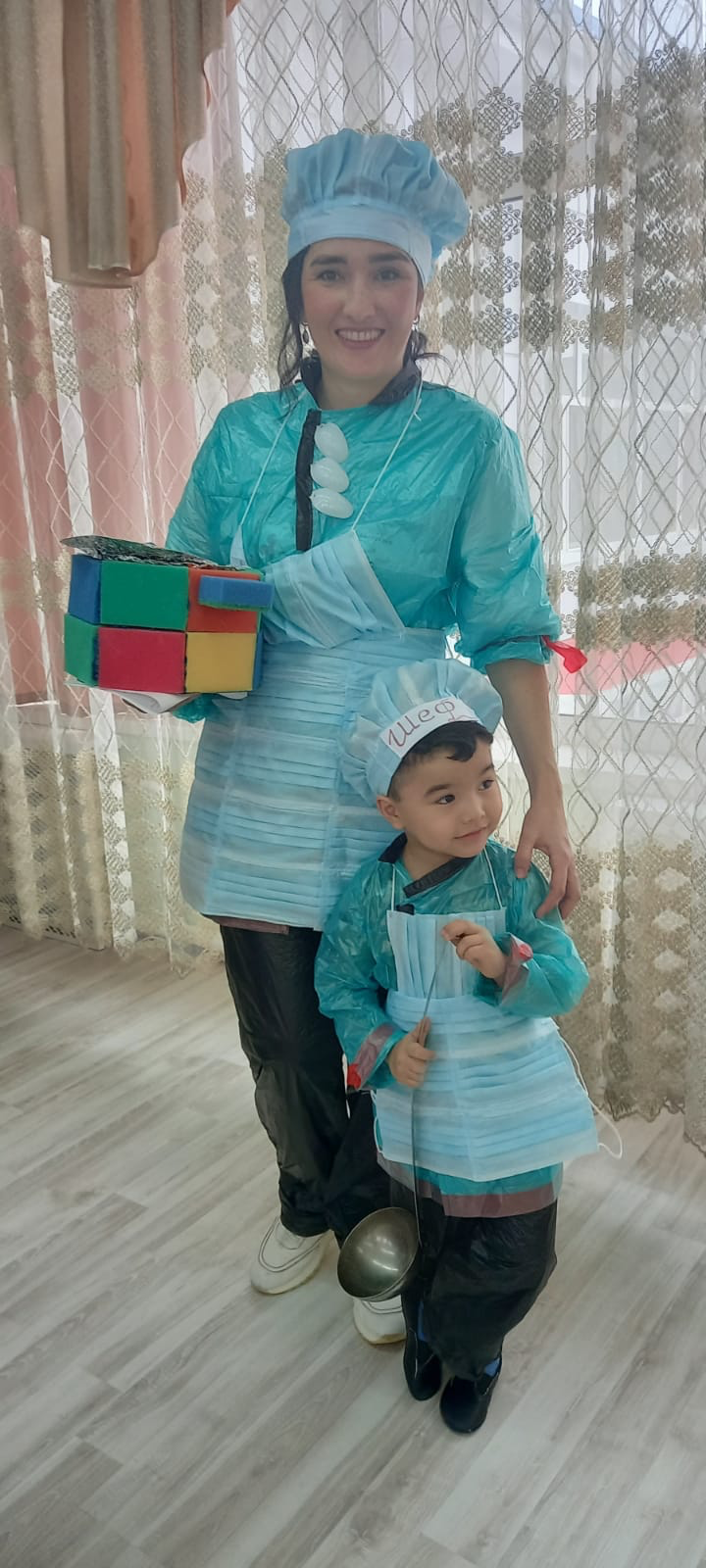То она примеряет костюмы из шикарных материй, то ей нравятся изделия в броских тонах, ну а в нашем детском саду мода решила примерить одежду из полиэтиленовых мешков, медицинских масок, губок для мытья посуды и т.д.