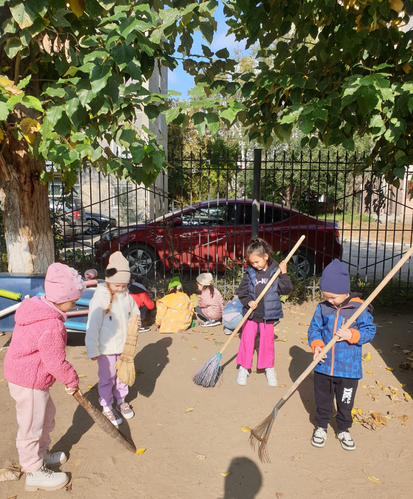 Кто то работал с граблями , кто-то подметал, а кто-то собирал мусор и листья.