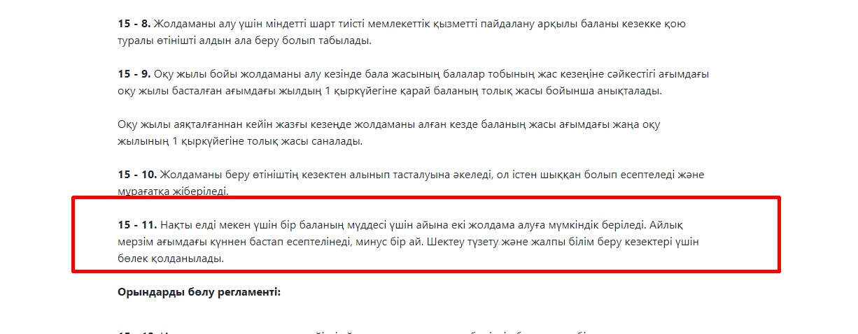 Құрметті ата-аналар, Сізден жиі сұрақ туындайды: «Мен жеке кабинетімде жолдама алдым, бірақ бұл балабақша бізге сәйкес келмейді, не істеу керек?» Жеке кабинеттегі жолдамадан бас тарту керек! - ол ушін не істеу қажет. • Жеке кабинетке кіріп, жолдама белімін таңдаңыз жене «етініштен бас тарту» түймесін басыңыз. 10 минуттан кейін сіз болмағанға дейін болған кезектегі өзгерістерді ескере отырып, «ез орныңызға» кезекке ораласыз. Қандай жағдайларда сізге «етініштен бас тарту» Қажет болады? -егер Сіз қате жолдама алсаңыз; -егер дурыс емес балабақшаға жолдама алсаңыз -егер Сіз қолайлы балабақшада бос орындарды керсеңіз және жаңа жолдама алғыңыз келсе; -егер Сіз бақшаға қабылдануға үлгермесеңіз және жолдаманы кешіктіргеніңіз үшін 10 кундік тоқтату-парағына кіргіңіз келмесе; Білу маңызды! Жолдаманы алған сәттен бастап бір тәулік ішінде «етініштен бас тартуа» болады; Егер Сіз 5 жумыс күні ішінде балабақшаға қабылданбасаңыз және жеке кабинеттегі жолдамадан бас тартпаған болсаңыз, онда сіз 10 жұмыс күніне арналған тоқтату-параққа кіресіз.