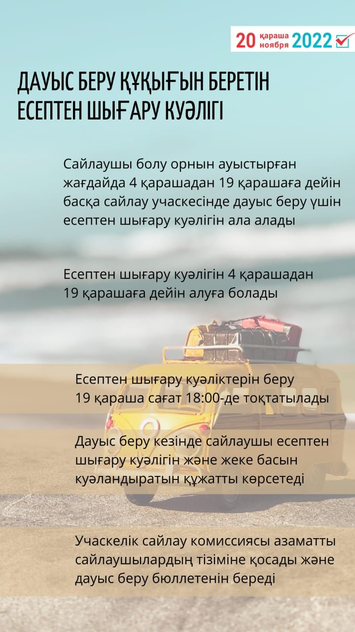 Егер Қазақстан Республикасының Президентін сайлау күні жол жүріп кетуіне байланысты азаматтың өз сайлау учаскесінде дауыс беру мүмкіндігі болмаса, онда оған баратын жеріндегі сайлау учаскесінде дауыс беруге болады. Ол үшін 4-19 қараша аралығында тіркелген жеріндегі сайлау учаскесінен алған есептен шығару куәлігі болуы қажет.