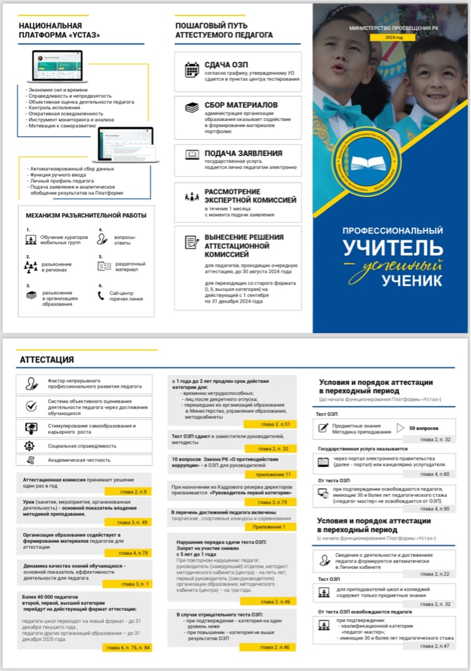 "Nº3 бебекжай - бакшасы" КМКК педагогтарымен аттестаттау ережелеріндегі негізгі езгерістер бойынша тусіндіру жумыстары жургізілді. Тусіндіру жумыстары жоспар бойынша жургізілді: 1. Аттестаттау философиясы 2. Білім берудін осы денгейін аттестаттаудын ерекшеліктері 3. Отпелі кезендегі жумыс туралы. 4. Платформа. Жумыс барысында олар ережелерді талкылады, негізі проблемалык тустарды атап етті, оларды шешу бойынша усыныстарды тындады, маселелерді белгіледі. Эдіскер О. В. Бабий педагогтарды аттестаттаудын, жана ережелерімен таныстырып, негізгі езгерістер туралы айтты: Біріншіден, сертификаттау процедурасынын кундылык параметрлері езгерді. Егер бурын мугалімнін жеке кэсібилігінде каншалыкты тиімді болганын керсету манызды болса жэне эркім эр турлі багыттагы жане денгейдегі іс-шараларга катысу ушін коптеген сертификаттар мен дипломдар жинаса, енді аттестаттаудан ету кезінде окушынын оку жетістіктері, онын білім сапасы жене сабак откізу сапасы басымдыкка айналады! Екіншіден, сертификаттау процестерін автоматтандыру, платформаны езірлеу мугалімнін портфолионы дайындаута кететін енбек жане уакыт шытындарын азайтып кана коймай, сонымен катар адам факторынын осы процеске эсер ету дережесін темендетеді. Муталім бул процесті дербес реттей алады, ейткені ол платформанын жеке кабинетінде езінін керсеткіштерін кереді. Осылайша мугалімнін касіби дамуынын уздіксіздігі ушін жадайлар жасалады. Бул аттестаттаудын жана ережелері философиясынын негізін калаган бесінші кундылык кагидасы. Табысты муталім-табысты окушы, кесіби кызметтін, басты максаты!!!