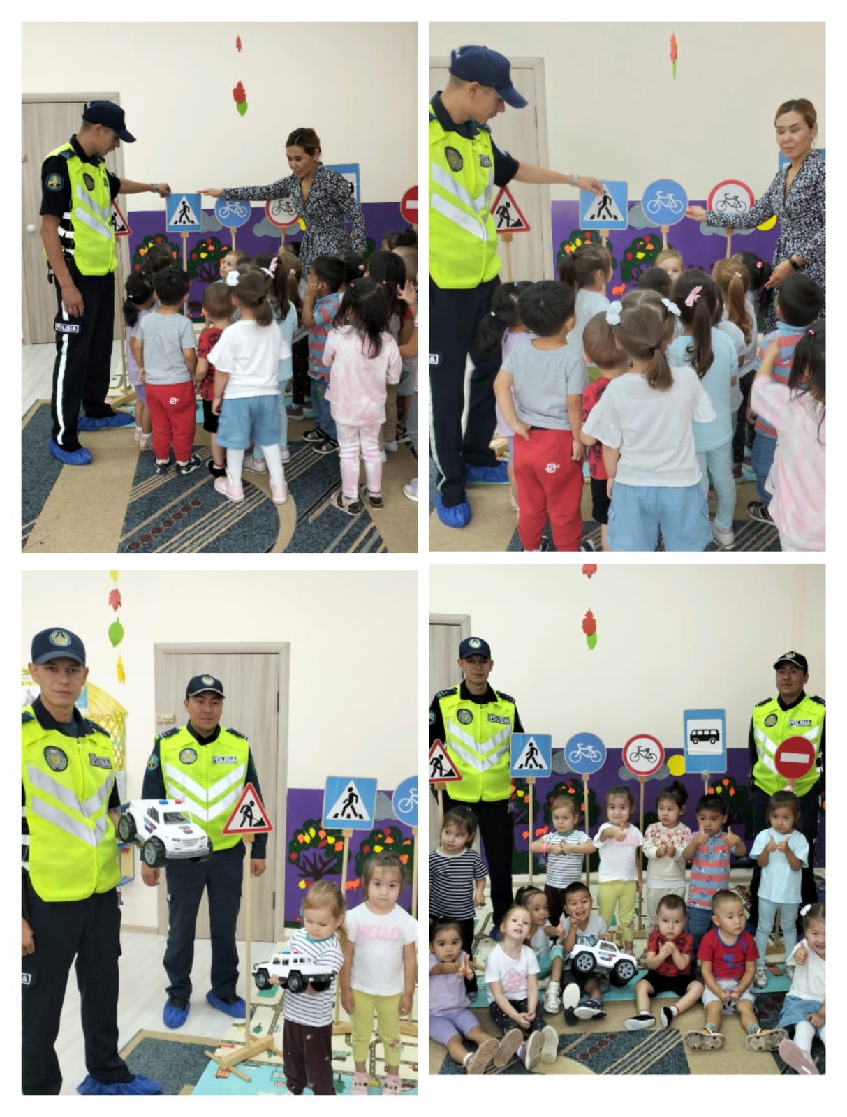 Патрульдік полиция қызметкерлері балалар ға жолда жүру ережелері мен белгілер ін көрсетіп таныстырды. Жолда абай болуға, жол қауіпсіздігін үнемі есте сақтауға шақырды.