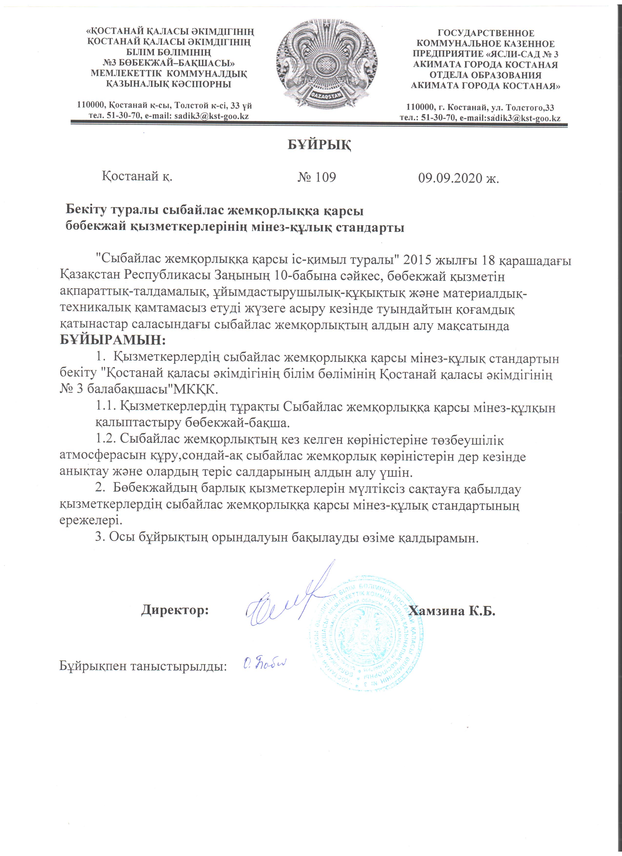 Бекіту туралы сыбайлас жемқорлыққа қарсы бөбекжай қызметкерлерінің мінез-құлық стандарты