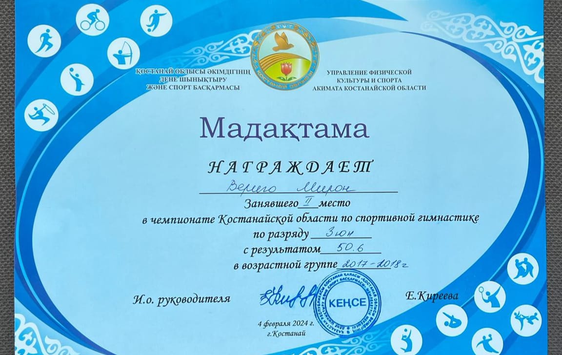 Воспитанник КГКП ясли - сада№3 предшкольной группы "Солнышко" Вериго Мирон занял 2 место в чемпионате Костанайской области по спортивной гимнастике .