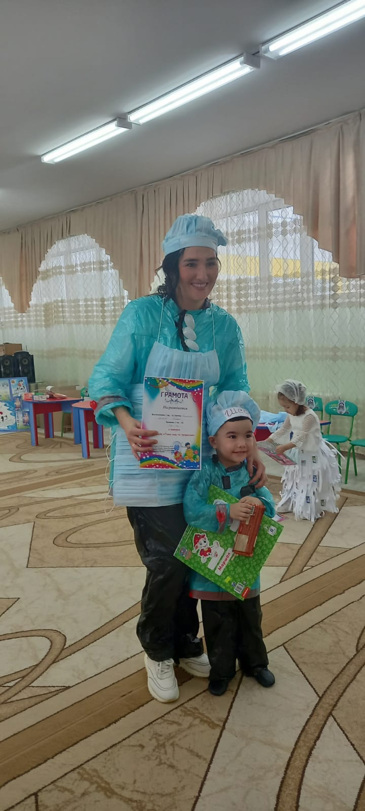 То она примеряет костюмы из шикарных материй, то ей нравятся изделия в броских тонах, ну а в нашем детском саду мода решила примерить одежду из полиэтиленовых мешков, медицинских масок, губок для мытья посуды и т.д.