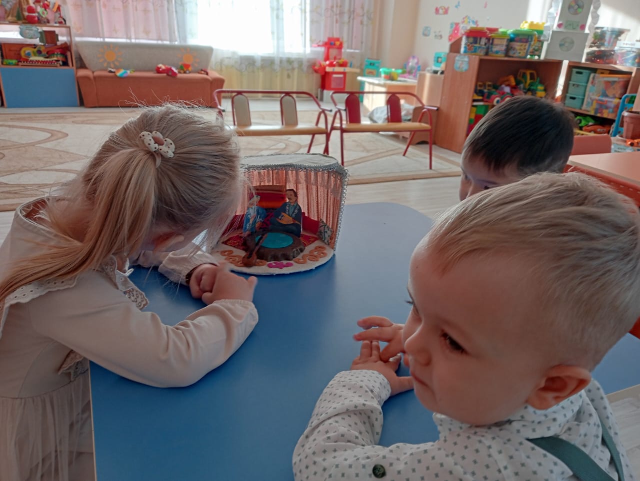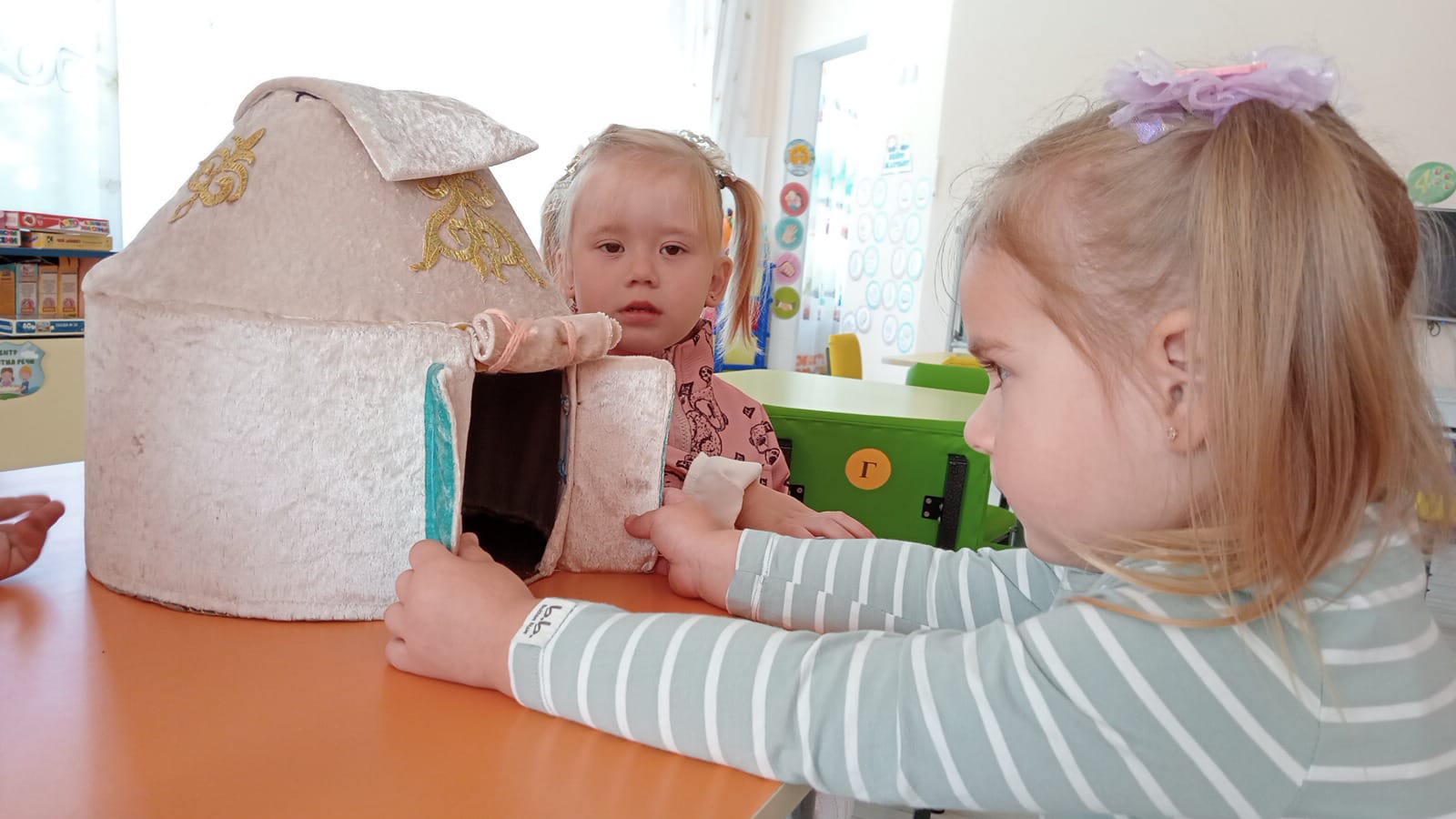 В КГКП "Ясли - сад №3" в рамках программы "Тілге бойлау" в средней группе "Радуга" дети знакомились с убранством юрты. Наши ребята произносят названия игрушек, предметов быта, животных на казахском языке.