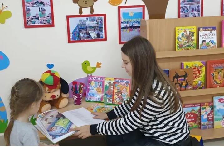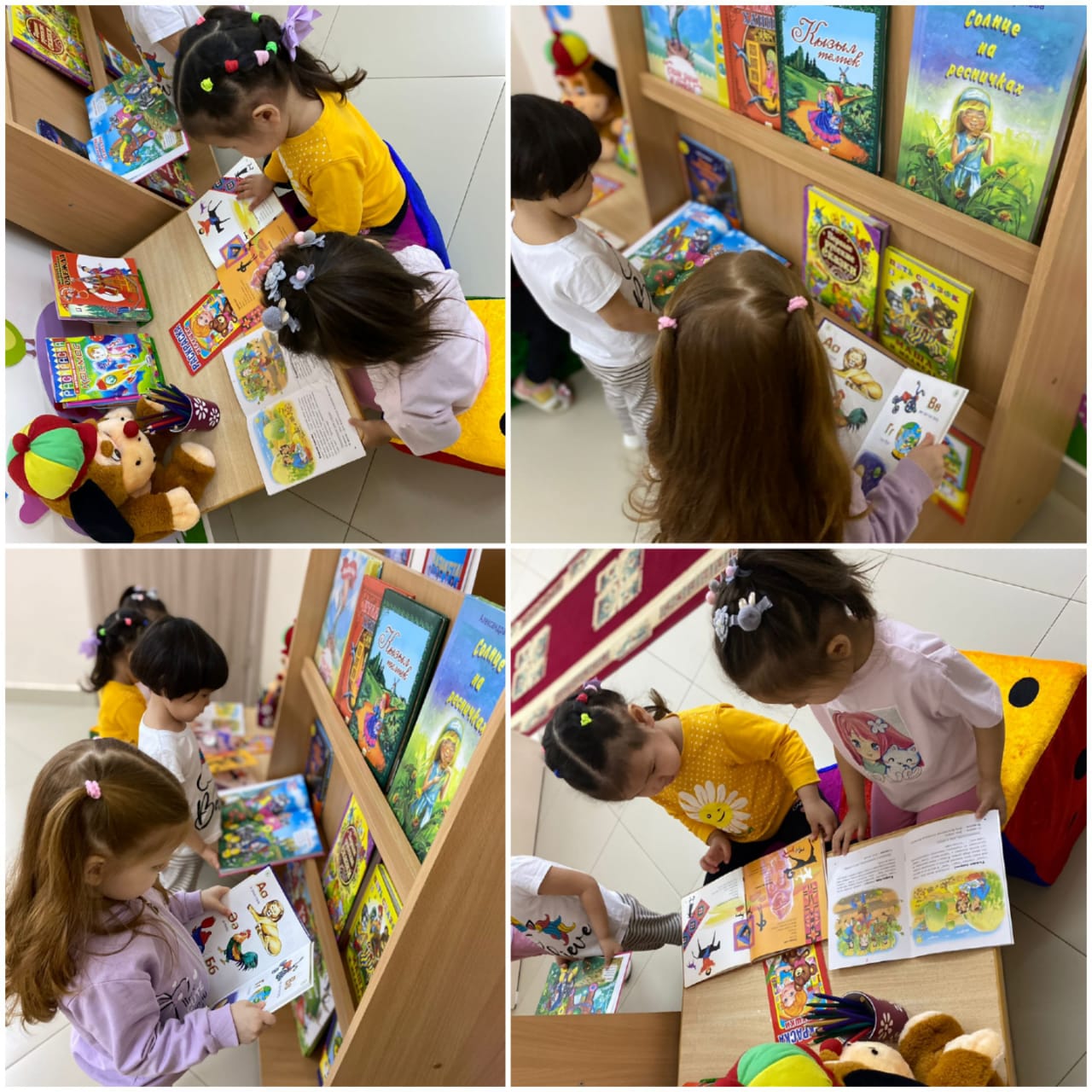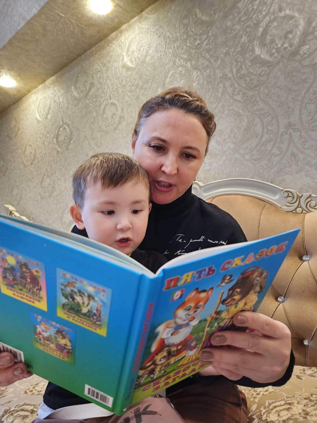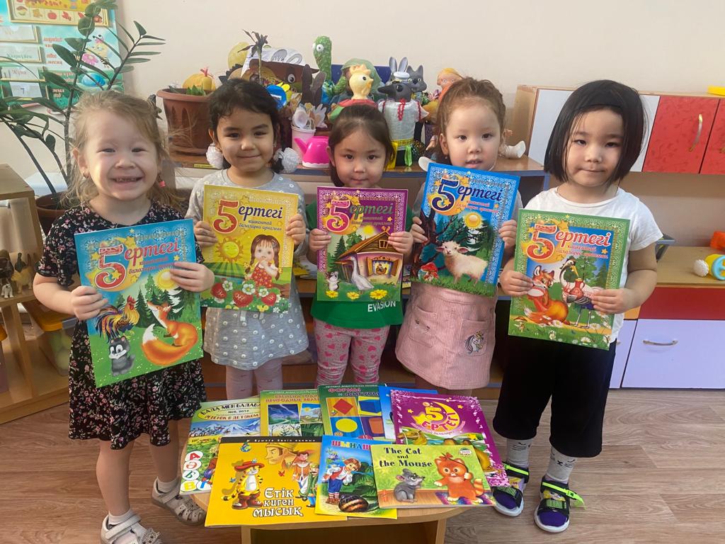 Родители с детьми читают детскую художественную литературу на казахском и русском языках. |